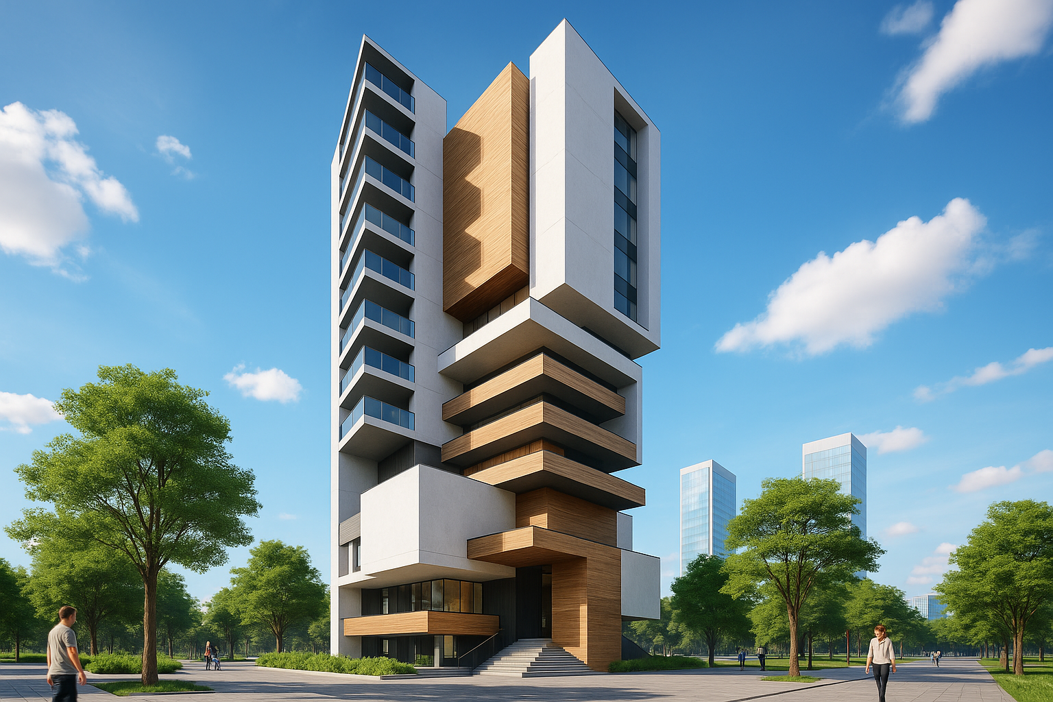 🏙️ แบบที่ 2: อาคารสูงโมเดิร์นแนวอนาคต — เล่นมวลยื่นลอยและเลเยอร์อย่างชาญฉลาด