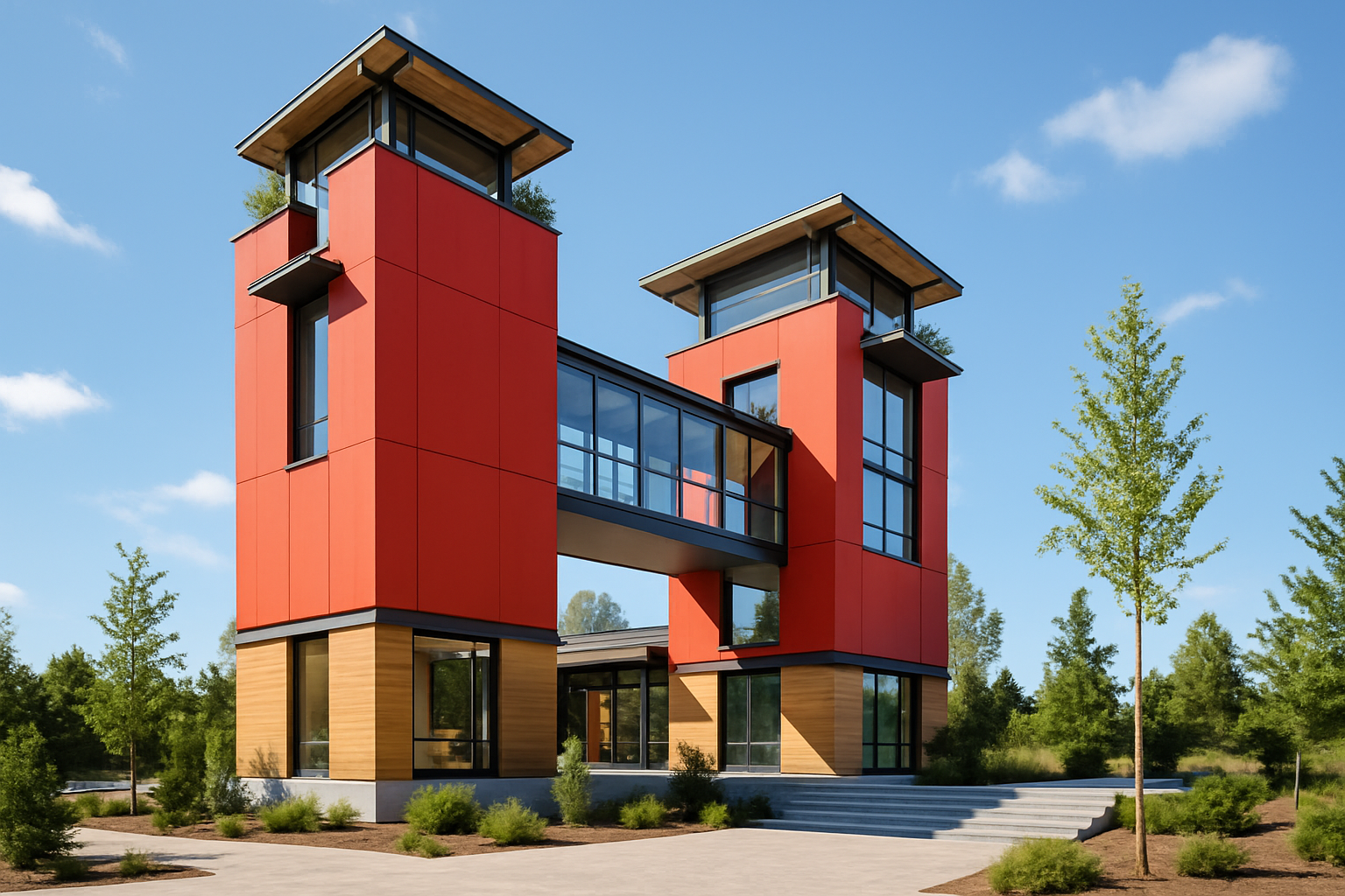 3 แนวคิดงานออกแบบอาคาร: ทาวเวอร์สีแดงสุดเท่, อาคารสูงโมเดิร์นแนวอนาคต, และบ้านคลาสสิกหรู — เลือกสไตล์ให้ตรงแบรนด์และการใช้งาน