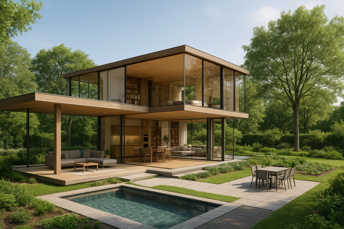 บ้านโมเดิร์นกระจกเต็มผืน: เปิดวิวธรรมชาติ 360° พร้อมชายคายื่นยาวและสระน้ำ สไตล์พูลวิลล่าหรูอยู่สบาย